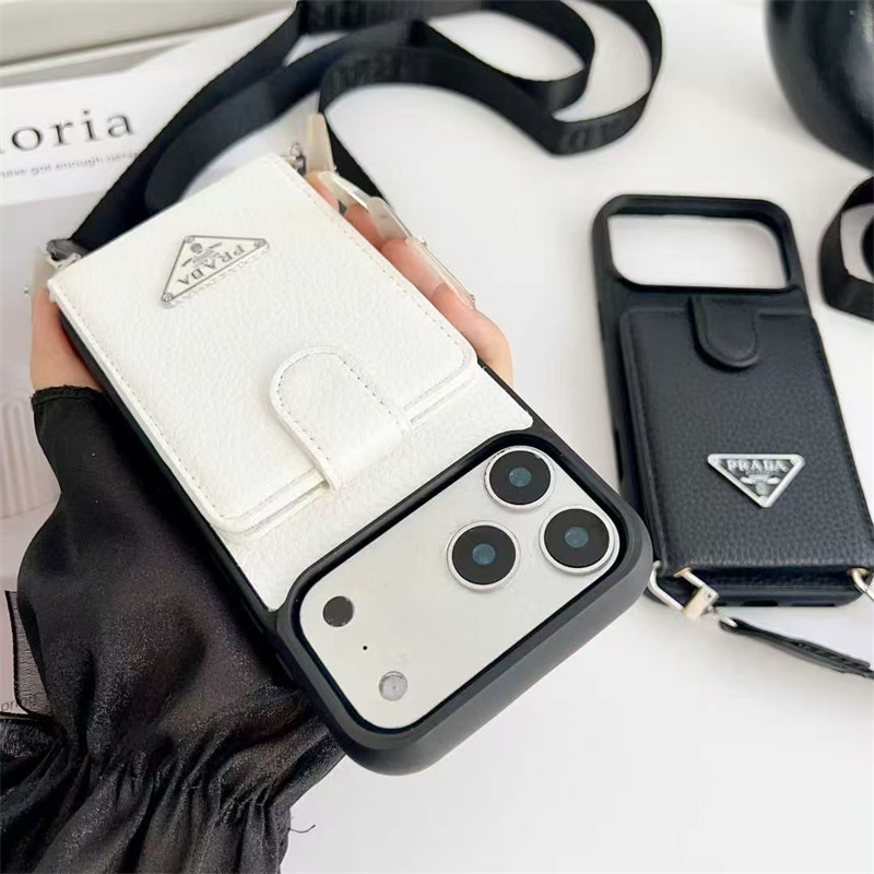 Pradaのレザー調iPhone17ケース最新作!背面に縦型カードポケット付きでカードを4枚まで収納でき、キャッシュレス派におすすめです。ショルダーストラップも付いており、首掛け・斜めがけできてハンズフリーが実現!またPradaのアイコニックなトライアングルロゴをあしらい、便利さの上ファッショナブルな雰囲気も演出します。白と黒の2色があり、おそろいアイテムとしてもぴったり!